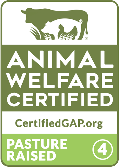 Global Animal Partnership (G.A.P.) sets a strict standard for animal husbandry, as well as additional requirements, including a vegetarian diet (no animal by-products), as well as prohibiting the use of hormones and antibiotics. All of our beef qualifies for G.A.P. Step 4, Pasture Raised, and is certified by Earth Claims.